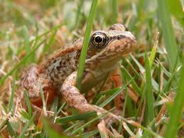 Note: photograph from Olympic Natural History photos. "Red-legged frog, Rana aurora. "Red-legged frogs are the largest native frogs in the western U.S. You can recognize a Red-legged Frog by the size, dark mask, light jaw stripe, dorsolateral folds and reddish color on underside of the legs."